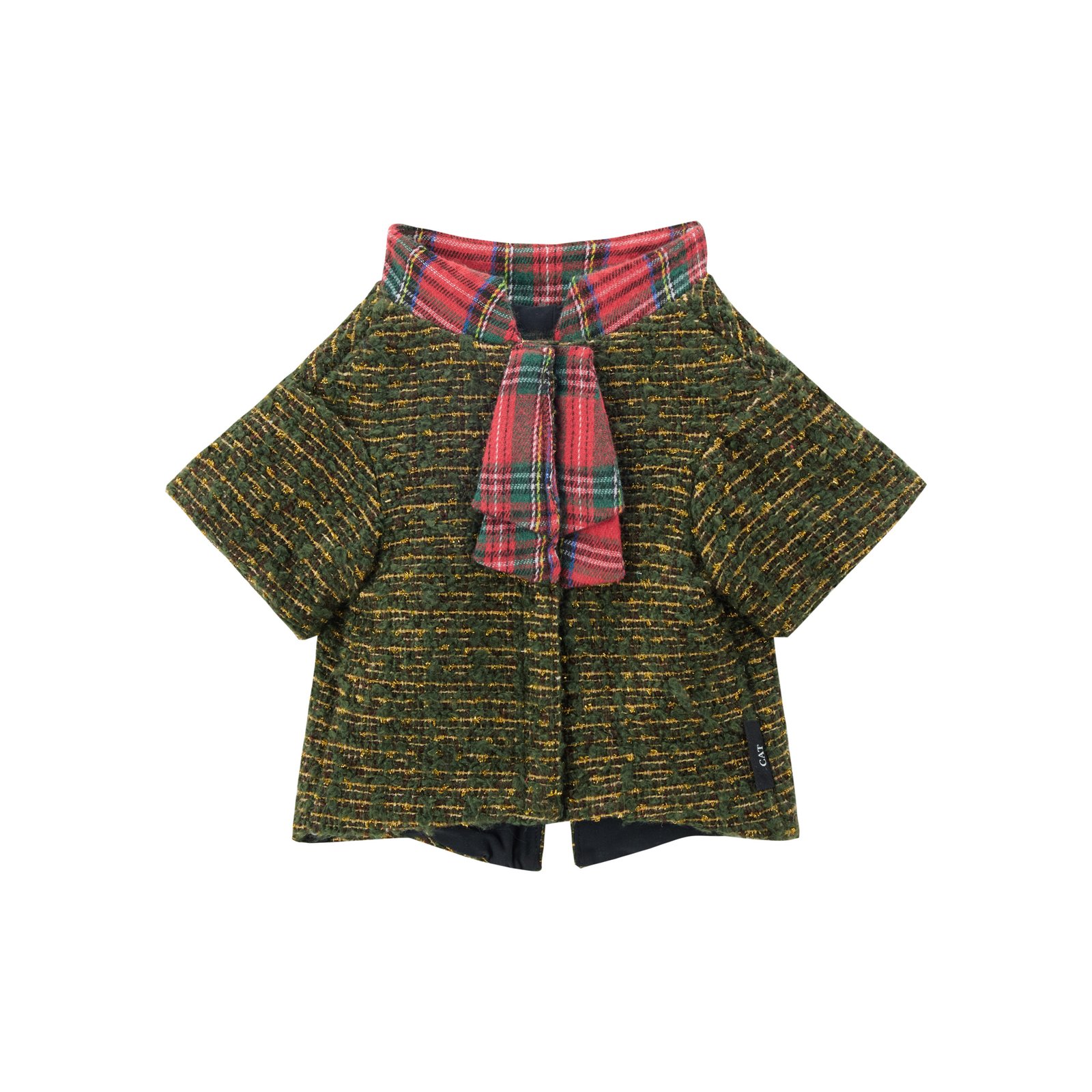 Scottish plaid spliced collar (red-green classic plaid) adds British academy style. Retro & trendy plaid keeps pets elegant/warm in autumn/winter. Dark green tweed body (yellow lines) is thick, soft, warm. Split hem + loose sleeves boost comfort; hidden plaid scarf-collar elevates style.